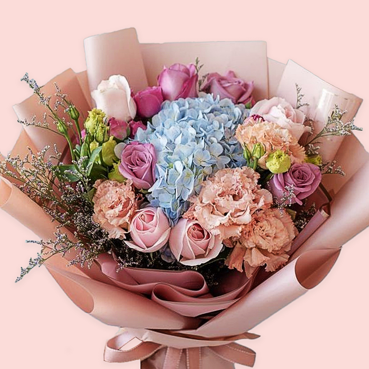 • ● 1 ساق من زهرة الهدرانج الزرقاء السماوية الطازجة، 6 قرنفل بألوان مختلطة، 13 وردة وردية وذات لون أرجواني، وحشوات ليمونيوم.
