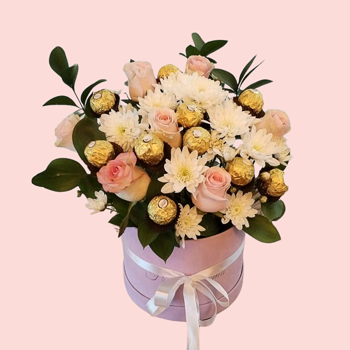 아름다움과 달콤함이 완벽하게 어우러진 "숨막히는 꽃과 초콜릿" 꽃다발을 즐기세요. 이 매혹적인 세트에는 순수함, 우아함, 사랑을 상징하는 신선한 꽃들이 포함되어 있으며, 흰 국화 2송이와 연한 분홍 장미 7송이가 있습니다. 생기 넘치는 초록 잎사귀는 신선함과 조화를 더하며 성장과 재생을 의미합니다. 더욱 기쁨을 더하기 위해, 우리는 10개의 페레로 로쉐 초콜릿을 포함시켰습니다. 황금 포장이 빛나는 모습이 한 입 한 입마다 오는 기쁨처럼 반짝입니다. 섬세한 꽃잎, 천상의 향기, 그리고 저항할 수 없는 초콜릿의 감각적 즐거움에 흠뻑 빠져보세요.이 꽃의 행복과 맛있는 간식의 매혹적인 조합으로 자신을 대접하거나, 특별한 누군가를 놀라게 해보세요. 당신의 애정과 감탄을 숨막히는 꽃과 풍부한 초콜릿의 세심한 조합으로 전달하세요. 이 잊지 못할 사랑의 선물로 그들의 얼굴에 미소를, 마음에 따뜻함을 전하세요. 달콤함.