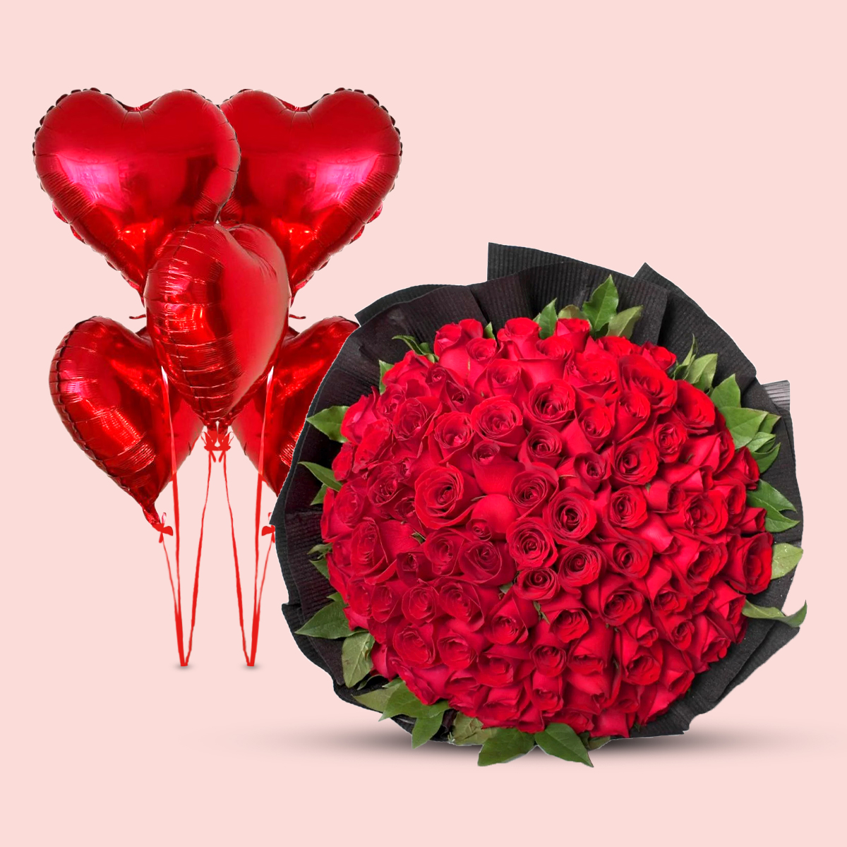 Turn grand gestures into unforgettable memories. This opulent gift pairs a breathtaking bouquet of 100 velvety red roses with a gleaming bunch of red heart foil balloons—a dramatic, love-forward statement that speaks volumes without a word. Designed for milestone romance, proposals, big anniversaries and Valentine’s surprises. A luxurious choice for your wife, fiancée or girlfriend when only the boldest bouquet will do.