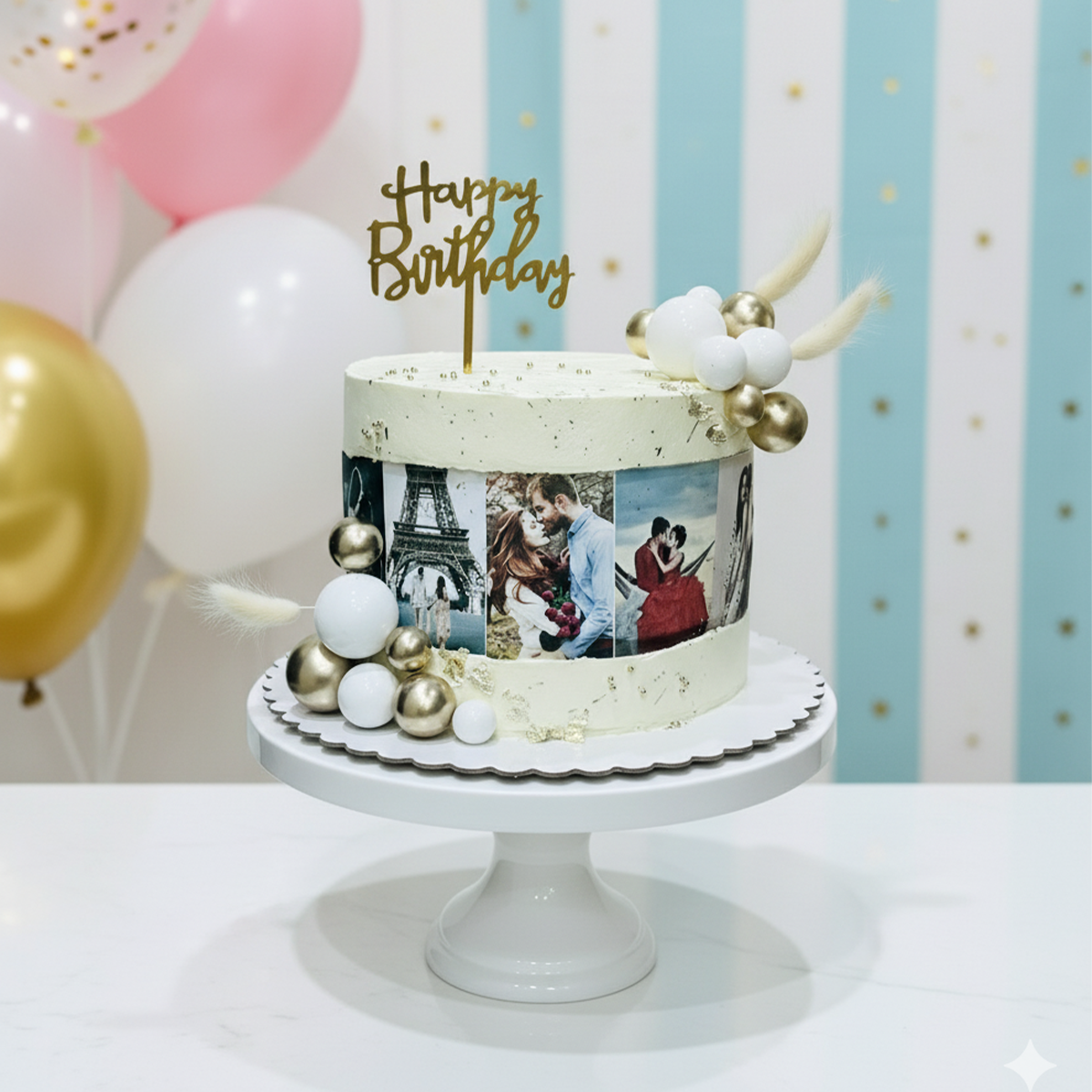 Celebrate your love story with a 2 kg anniversary cake wrapped in your favorite moments. We print your chosen photos on edible sugar sheets and finish the design with elegant buttercream and metallic accents—add a custom topper or message on the board. Serves approx. 16–20.