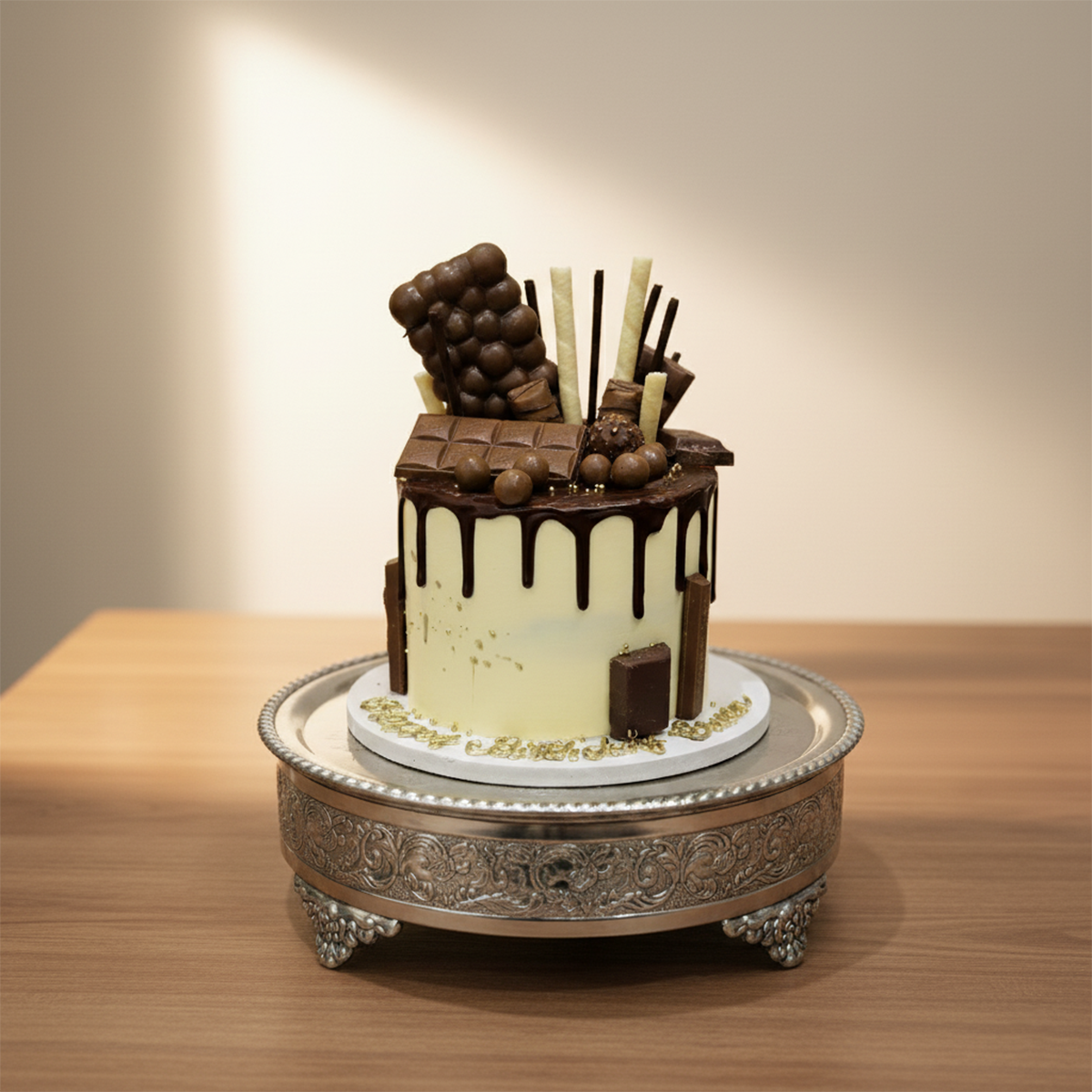 Pure chocoholic bliss in a 1 kg celebration cake. Moist chocolate sponge layered with silky cocoa frosting, finished in smooth vanilla-chocolate buttercream and a glossy dark drip. Topped sky-high with assorted chocolates—bars, truffles, wafers and malt balls—for a rich, crunchy finish.