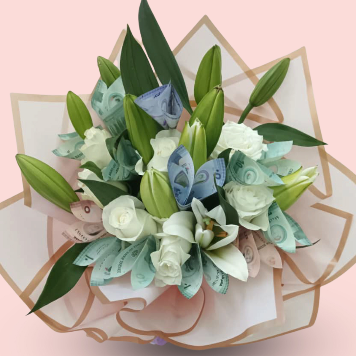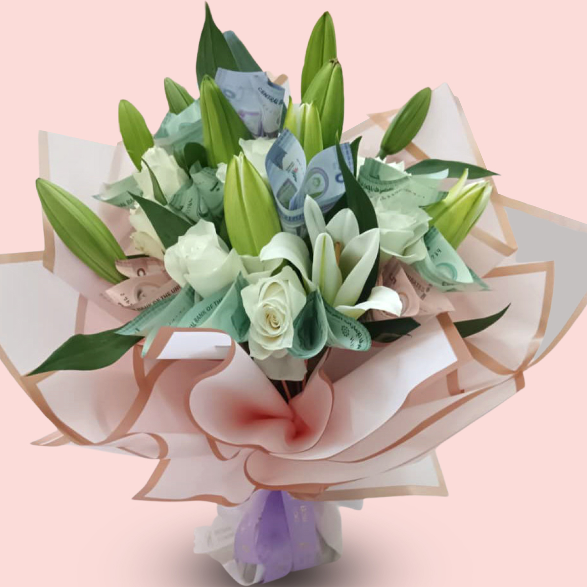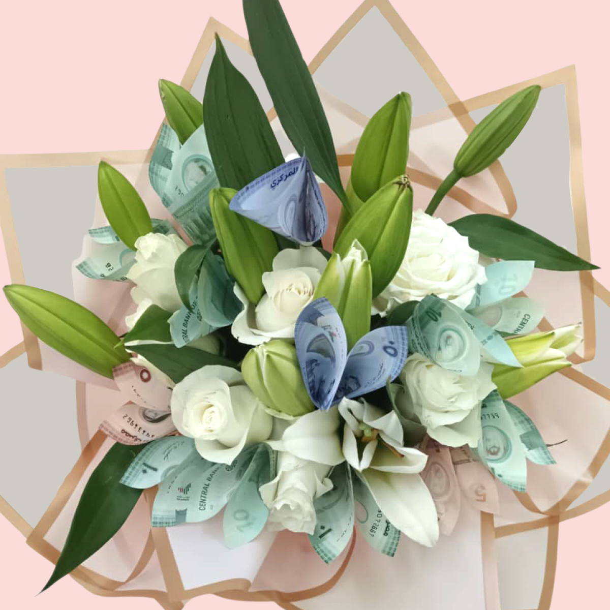 A graceful way to say “congratulations” with beauty and practicality. This refined money bouquet blends 4 pristine white lilies and 7 ivory roses with 13 carefully folded banknotes totaling AED 200, presented in soft blush wrap and glossy greenery. A unique, photo-ready gift for graduations, job wins, birthdays, or generous thank-yous. Thoughtful for family, friends, colleagues and mentors.