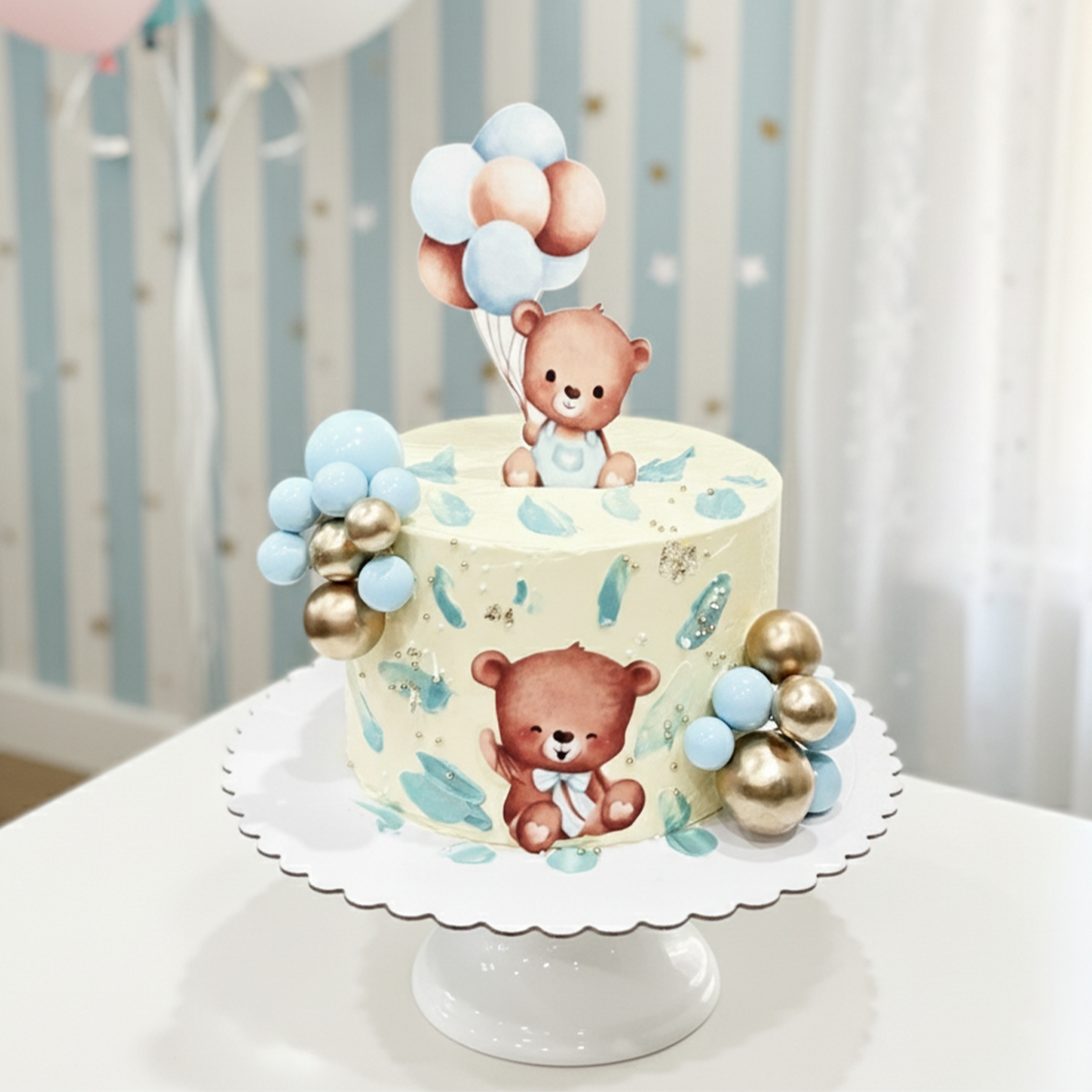 A charming 2 kg gender-reveal cake featuring a sweet teddy bear theme, pastel buttercream textures, and balloon-style sugar spheres with a touch of gold. Slice to unveil a hidden pink or blue interior announcing baby’s gender. Add a custom message on the board. Serves approx. 16–20.